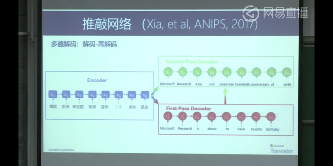 推敲网络是什么意思呢?就是说有一个编码,第一步先解码得到了一个译文,不把它直接输出,觉得还应该再推敲一下,有些字词我可以调一调。那么就进行二次解码,二次解码的时候,把原来那个输入句子的编码和第一遍解码输出的结果都作为神经网络输入,再进行解码。这样连续几次解码的效果,每一次都会再进一步的提高。