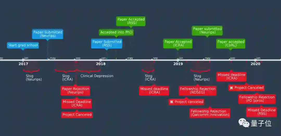 Andrey一上来就贴出一条时间线,详细记录了读博3年来所有的失败。