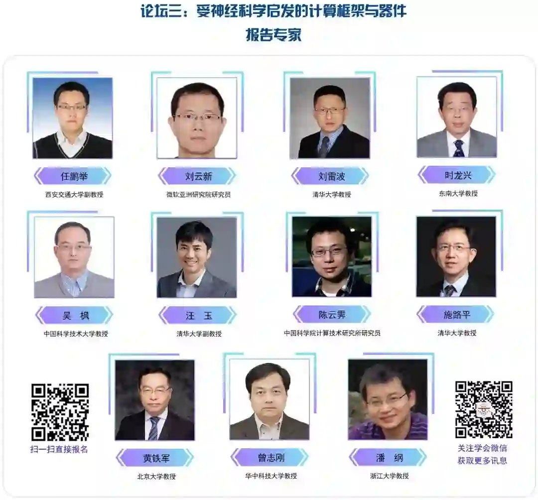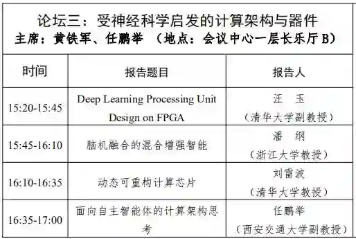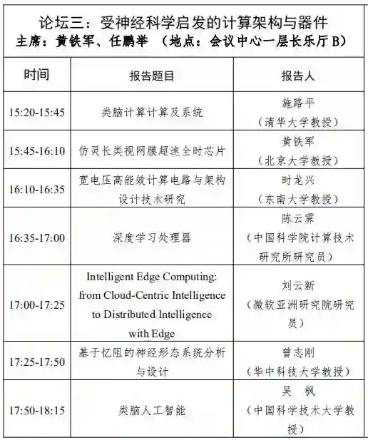 本次大会包含大会报告环节及4个大会专题论坛,共邀请了58位报告嘉宾。今天为大家介绍的是专题论坛三:受神经科学启发的计算框架与器件的两日详细日程与该专题论坛的11位报告专家(可点击阅读原文查看更多报告专家信息)。