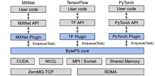 字节跳动人工智能实验室开源的 BytePS,通过实现一个通用的抽象层,抽象层可以被各种通用框架引用,实现了同时支持多个框架的可能性,因此能够支持 Tensorflow、PyTorch、MXNet 等行业主流训练框架。