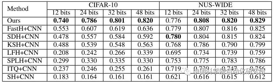 表3:第一组实验设置下不同方法的 MAP 。NUS-WIDE 数据集的 MAP 是根据返回的前 5,000 位邻近值计算的。