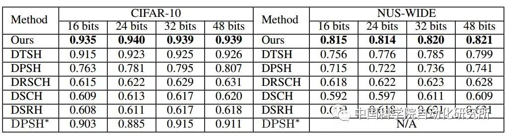 表1:第一组实验设置下不同方法的 MAP。 NUS-WIDE 数据集的 MAP 是根据返回的前 5,000 位邻近值计算的。DPSH * 表示重新运行 DPSH 作者提供的代码。