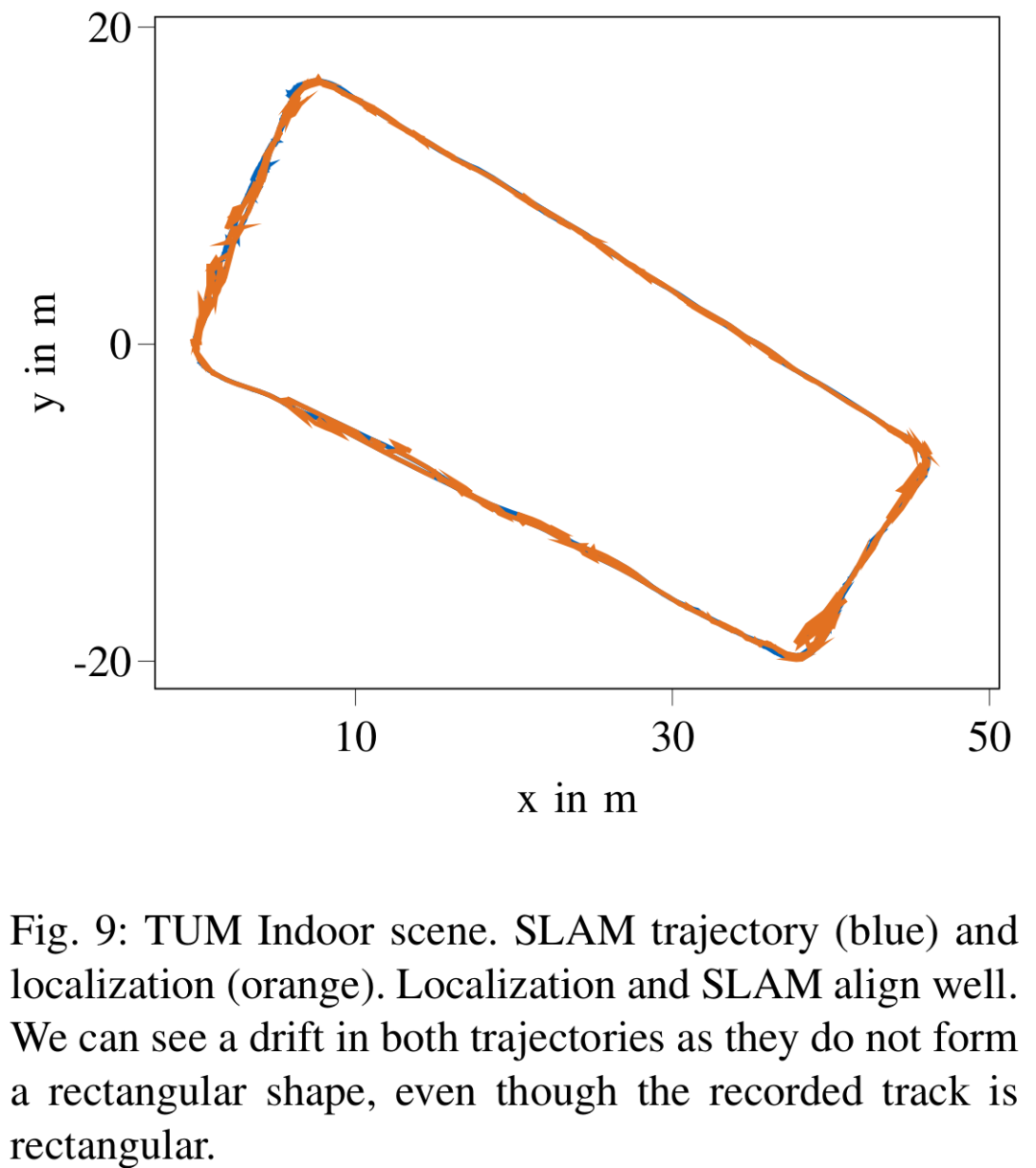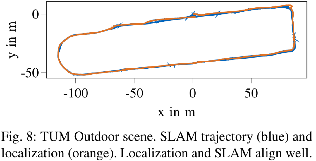 图8 : TUM数据集户外场景。SLAM轨迹(蓝色)和定位(橙色)。定位和SLAM轨迹相近