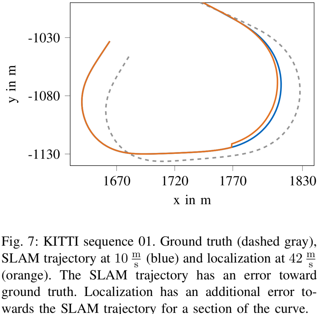 我们使用KITTI数据集的场景来评估已建成SLAM地图的定位精度。此外,我们用自己的小型电动模型车记录的数据对构建的地图进行了定位精度测试。测试结果表明,在特征丰富的环境中,对于直线速度平均为36 m/s行驶的车辆而言,定位的相对平移误差可以保持在1%以下。与完全SLAM相比,该定位模式拥有更好的定位精度和更低的计算负荷。我们对ORB-SLAM2拓展的源代码将在以下网址公开:https://github.com/TUMFTM/orbslam map-saving-extension