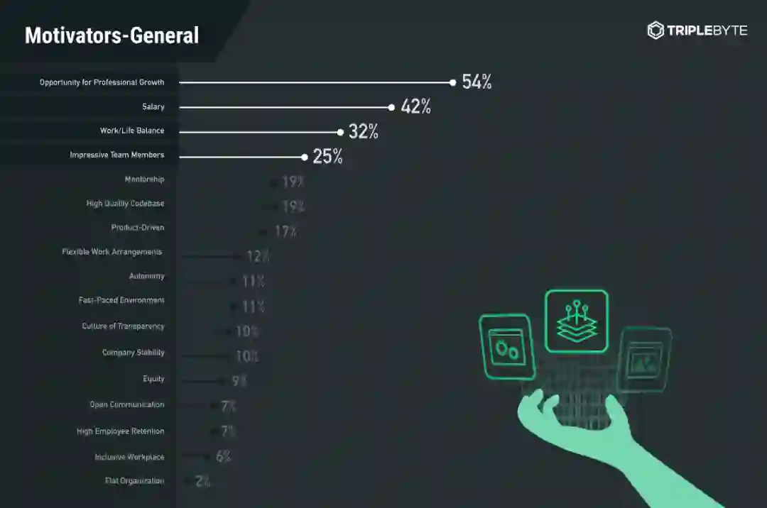 每个星期,Triplebyte 会促成几百个程序员和 450 多个科技公司的牵手。对于软件工程师和想招聘他们的公司来说,我们有点像是给他们提供的一个交友网站。因此,和一般的交友网站一样,在平台上,我们会询问每个工程师,在下一份工作中,最可能让他们觉得激动的是什么,以更好地选择相应的公司。我们根据工作环境属性来选择其中的一部分作为激励项。这些因素包括“职业发展机会”、“导师制”和“包容的工作环境”。