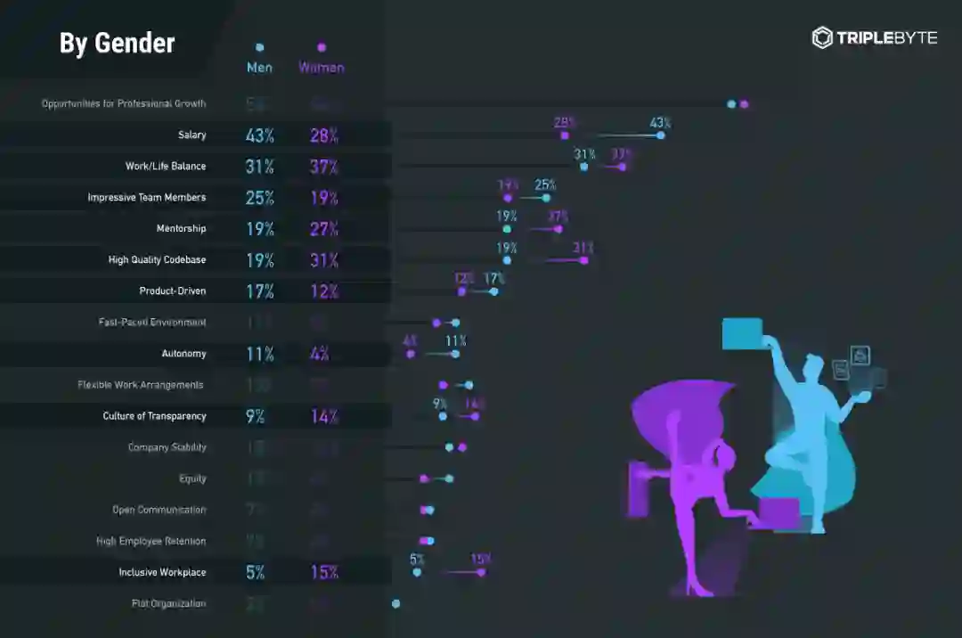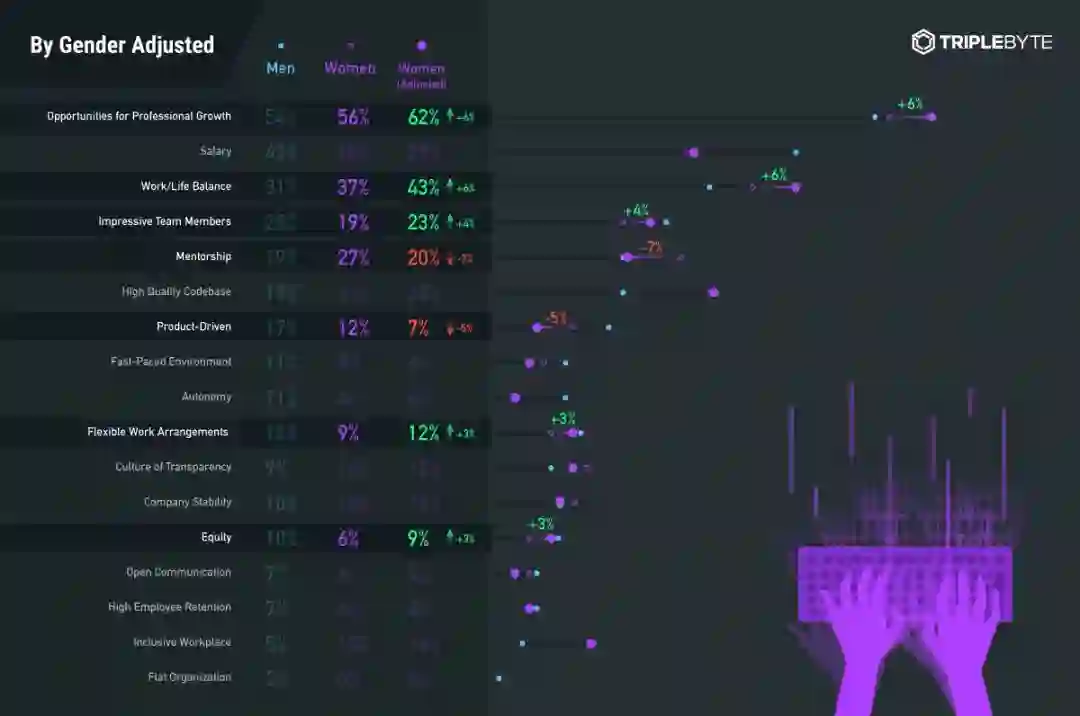 有些区别消失了。比如,“导师制”对于男女求职者来说没有差别(男性 19%,女性修正后的为 20%)。“职业发展机会”仍为主要的激励因素,62% 的女工程师选择职业发展为激励因素。