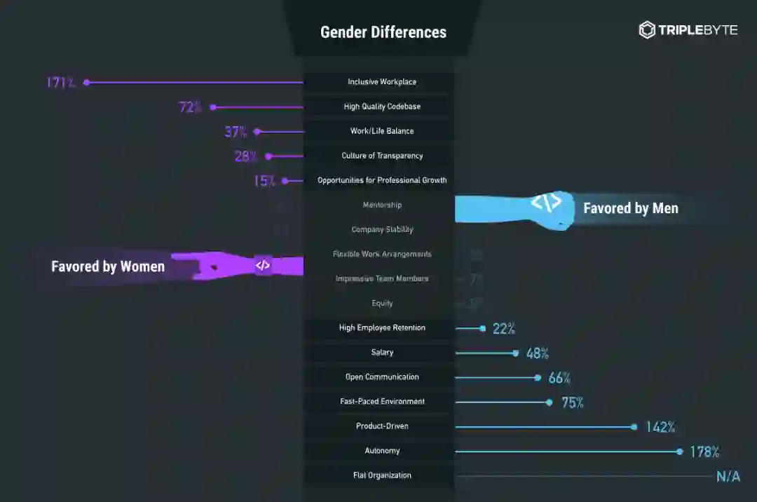 相反的,男性,从统计结果看,更多的选择“自主权”、“薪水”、“快节奏的工作环境”、“扁平组织管理”、“产品驱动”和“开放的沟通”。这里面,有些和传统上对性别的认识一致,不需要过多的解释。有些求职者可能是依从本心的选择,而另一部分则可能是迫于社会压力需要去遵守。两种情况下,在找工作中,他们都显然会优先考虑这些因素。