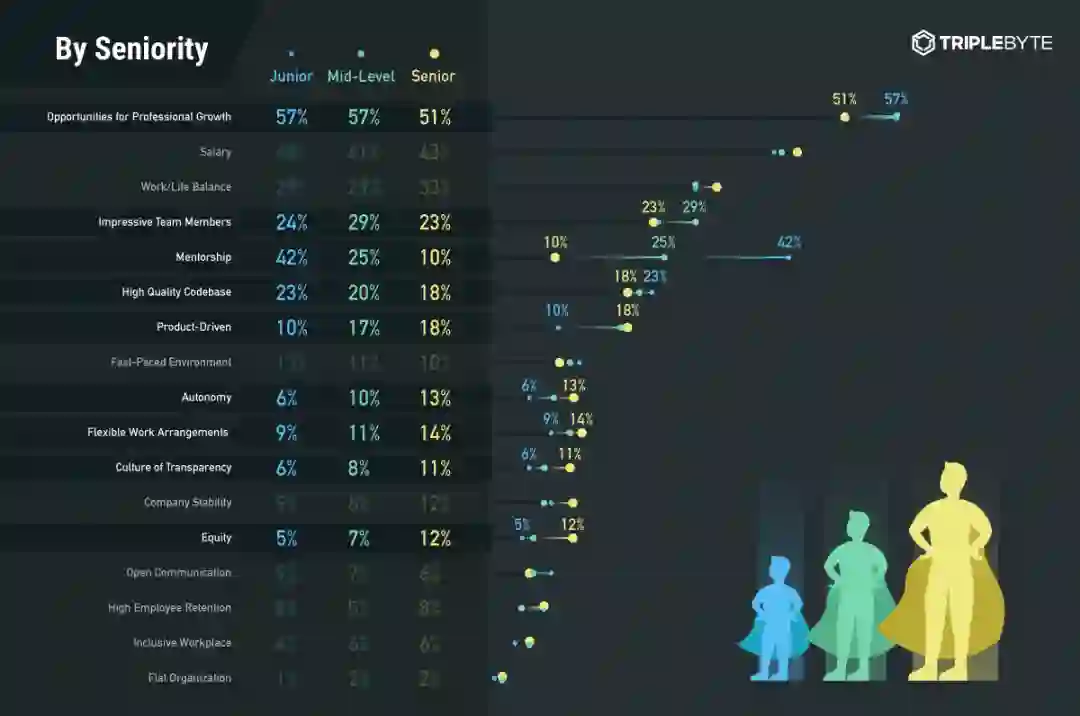 实际上,高级工程师选择“职业发展机会”的稍微少一点,但区别很小,发展仍占据首位。