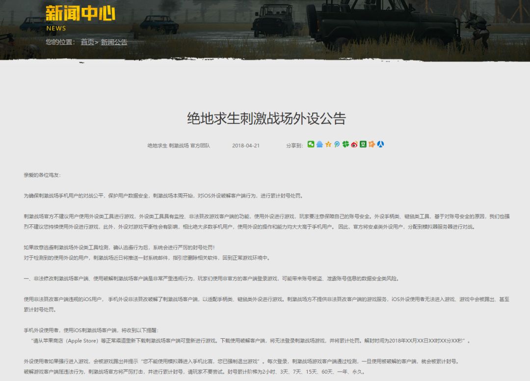 《绝地求生:刺激战场》发布针对外设的处罚公告