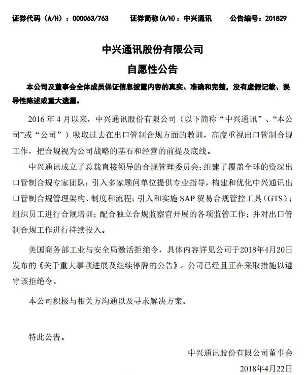 中兴通讯发布自愿性公告:正在采取措施以遵守拒绝令
