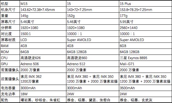 在经历了高管离职风波,魅友声讨杨柘等一系列事件后,魅族 15 Plus 昨天在乌镇如约发布。昨晚的发布会上,魅友们并没有听到“老白”白永祥熟悉的“云普”,取而代之的是杨柘一口标准的普通话。魅族的 15 系列分为三个产品:M15、15、15 Plus ,价格段覆盖 1699-3299,在这里给大家做了一张表,可以清晰的看到三款机器不同的配置: