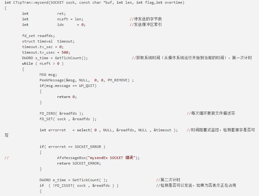 mysend函数用来发送指定的套接字数据。sock为指定的Socket。buf为用来存放要发送的数据的缓冲区。len为待发送数据的长度。flag一般设置为0。overtime为超时时间。这里采用了select机制防止I/O操作阻塞,提高了程序运行效率。这里要注意每次执行select操作之前都要更新文件描述符,因为select操作会更改文件描述符。