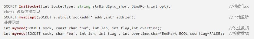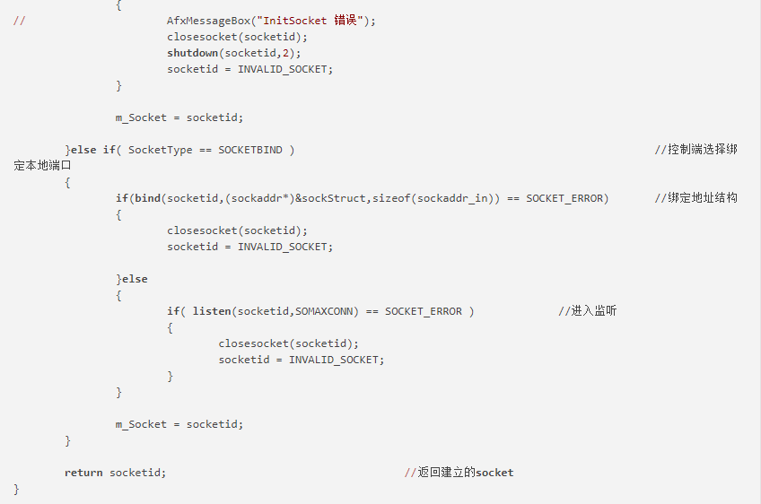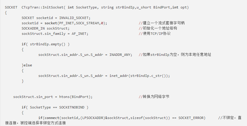 InitSocket参数解释如下,SocketType为连接类型,当值为 SOCKET_BIND时表示绑定本地端口,服务器监听端口等待客户端来连接,当值为SOCKET_NOBIND时表示不绑定,服务端主动连接客户端。strBindIp为要绑定的IP地址,””(空)为本地任意地址,这样做的目的是当服务器有多块网卡时,不论哪个网段上的客户程序都能与服务器通信。uBindPort为要绑定的端口。