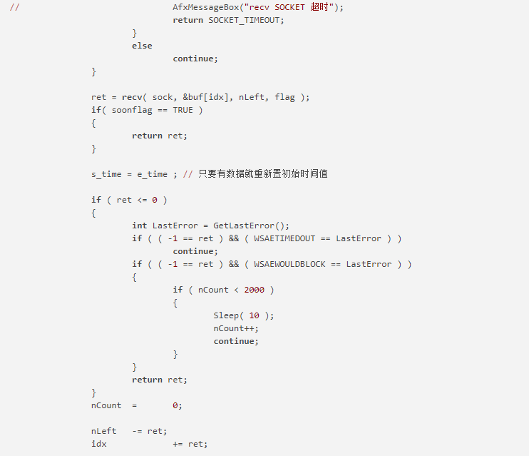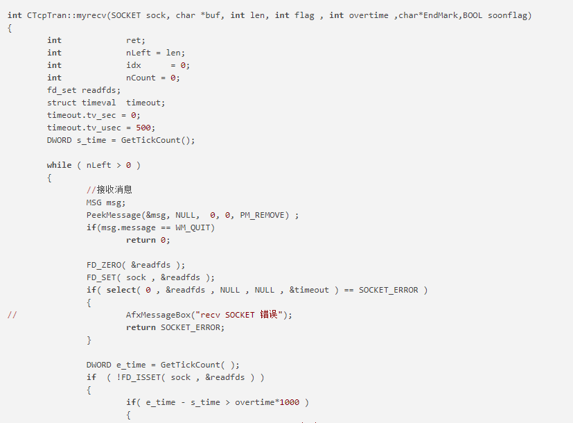 myrecv函数用来接收指定的套接字数据。sock为接收端套接字描述符。buf 用来存放接收到的数据的缓冲区。len为接收数据的缓冲区的大小。flag一般设置为0。overtime为超时时间。endmark为结束标记。soonflag为是否立即返回结果,默认为否。与mysend函数一样采用select机制防止I/O操作阻塞。