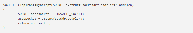 服务器接收客户端的连接请求,创建一个新的套接字和参数addr指定的客户端套接字建立连接通道。s表示处于监听状态的流套接字。addr表示新创建的套接字地址结构。addrlen表示新创建套接字的地址结构的长度。
