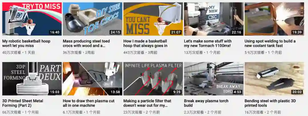 除了我们介绍的两个篮板视频外,Shane Wighton 的 YouTube 频道中的其他视频也多与「制造」相关。