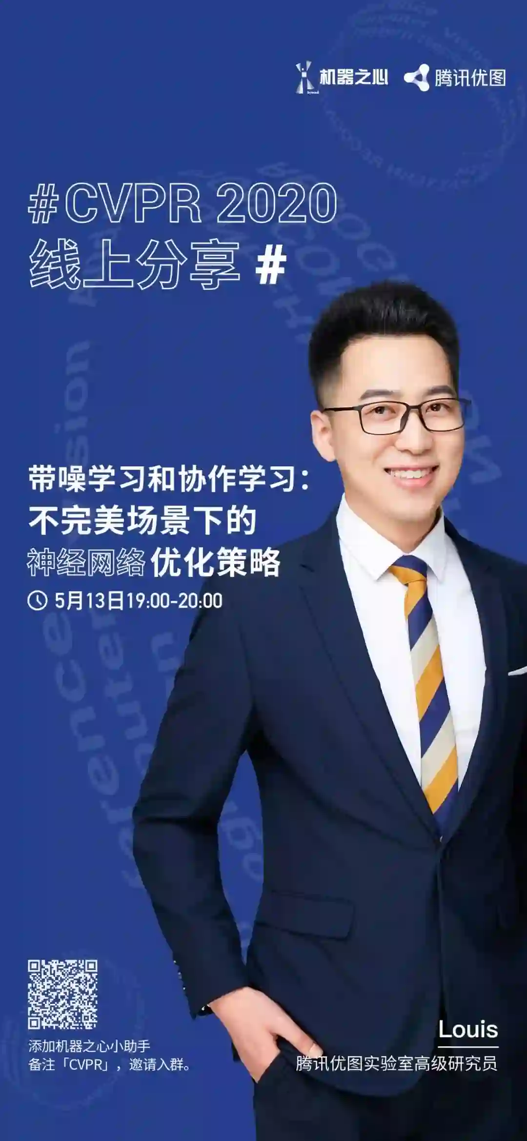 机器之心 CVPR 2020 线上分享的第三期,我们邀请到腾讯优图实验室高级研究员 Louis 为我们做主题为《带噪学习和协作学习:不完美场景下的神经网络优化策略》的线上分享,欢迎读者报名学习。