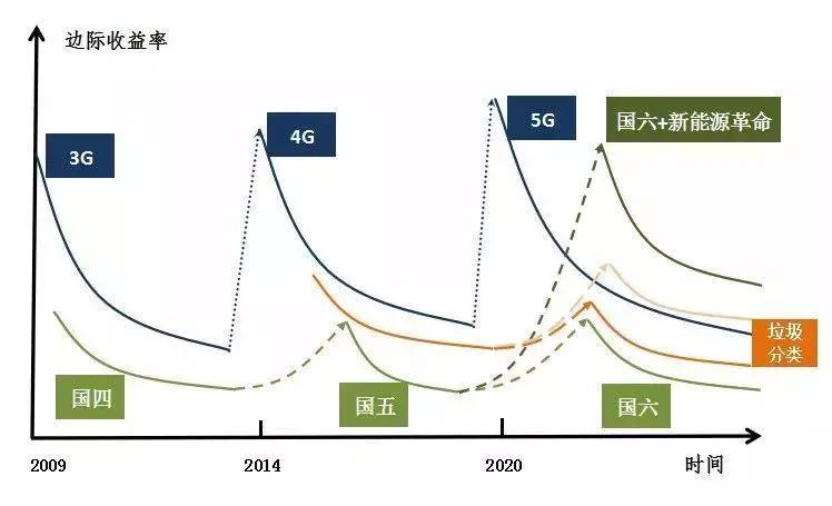 与3G、4G、5G引发的效率革命不同,国四、国五标准都没有倒逼汽车爆发科技革命,只是促进汽车节能方面的技术提升。国四、国五标准对边际收益率的提升非常有限,增长率波动幅度远远小于通信及电子行业。