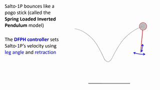 Salto-1p机器人的行为或多或少像弹簧倒立——一个简化的动力学模型,经常出现在生物学和机器人的应用中。它有自己的收缩与滑动。DFPH用腿角和收缩来设置机器人的速度,因为它超高的精确度,我们可以告诉Salto-1p它即将要到哪儿去。