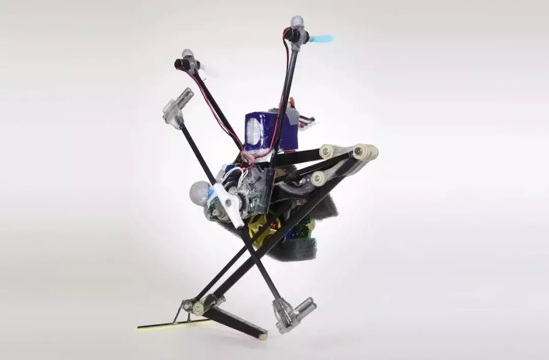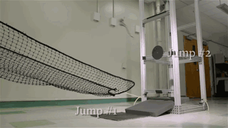 它有一个驱动的弹性腿,可以使它跳跃,一个惯性尾巴,可以旋转来控制俯仰,还有半个四轴飞行器来控制偏航和翻滚。这个机器人能够各处弹跳,能够连续跳跃,没有任何问题。