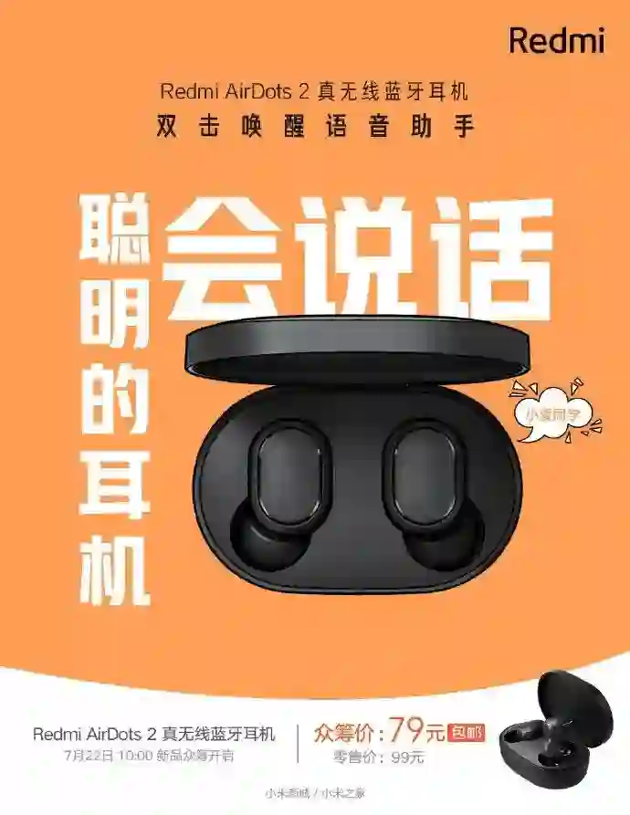 小米 Redmi AirDots 2 真无线蓝牙耳机今日官宣,蓝牙 5.0,机身为 4.1g ,拿起即连接,戴上就能用,将于 7 月 22 日上午 10 点开启众筹,众筹价为79 元,零售价 99 元。Redmi AirDots 2 真无线蓝牙耳机采用 7.2mm 发声单元,DSP 数字降噪,双击唤醒小爱同学。