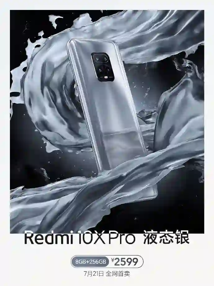 Redmi 10X Pro 新配色:液态银。Redmi 10X Pro 液态银 8GB + 256GB 售价 2599 元,将于 7 月 21 日全网开卖。将搭载天玑 820,4520mAh 电池、支持 33W 快充。