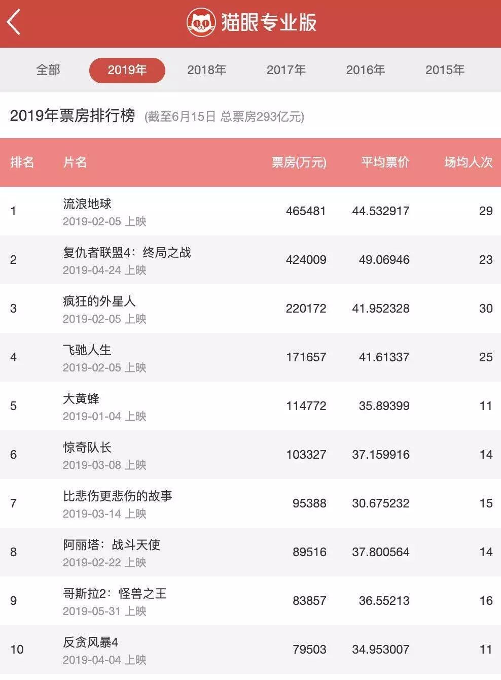 在 2019 年 1 月—5 月上映的影片中,除了《流浪地球》《复仇者联盟 4》等热门电影拿到不错的票房外,其他电影表现均低于预期。票房达 10 亿以上的电影只有 6 部:《流浪地球》(46.5 亿)、《复仇者联盟 4》(42.2 亿)《疯狂的外星人》(22 亿)、《飞驰人生》(17.2 亿)、《大黄蜂》(11.5 亿)、《惊奇队长》(10.3 亿)。