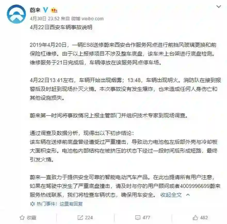 5月1日,蔚来官方微博公布了4月22日西安ES8自燃事故说明,初步结论是底盘曾遭撞击导致电池短路。