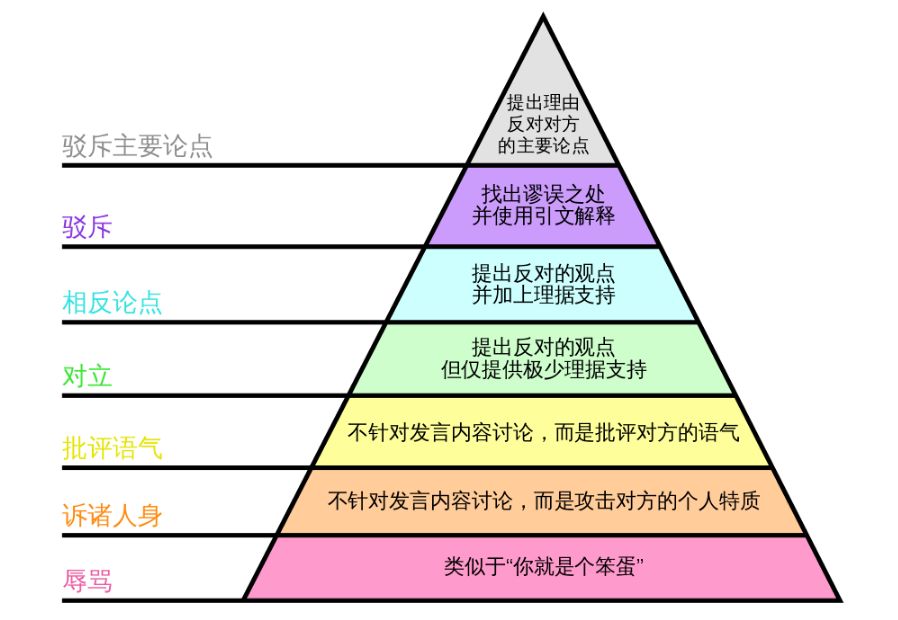 硅谷创业之父 Paul Graham,在一篇文章 How to disagree 中,提出过一个经典的“反驳金字塔”(Hierarchy of Disagree):