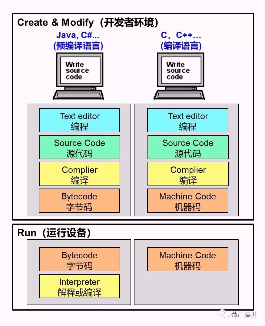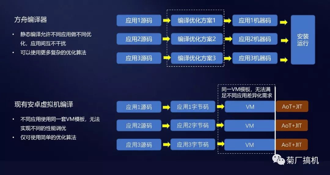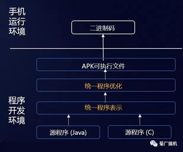 安卓主要使用预编译的Java语言开发,最初版本通过虚拟机运行,不需要编译器,后续版本加入了JIT和AOT编译机制(下一部分将详细展开)。