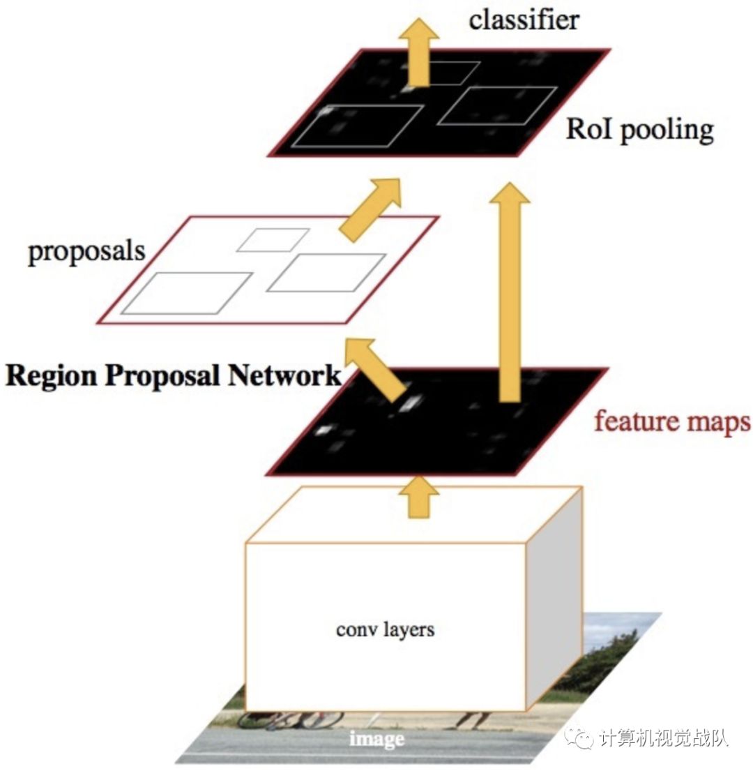 于是就有了直接使用CNN产生region proposal并对其分类,这就是Faster R-CNN框架,如下图: