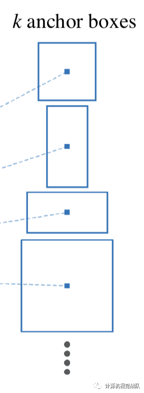 现在,我们假设现在的feature map尺寸为W x H x C(13x13x256就是feature map的Width=13,Height=13和Channel=256),在feature map使用滑动窗口的操作方式,当前滑窗的中心在原像素空间的映射点就称为Anchor,并且以Anchor为中心去生成K(paper中default K=9,3个尺寸和3个缩放比例)个proposals。