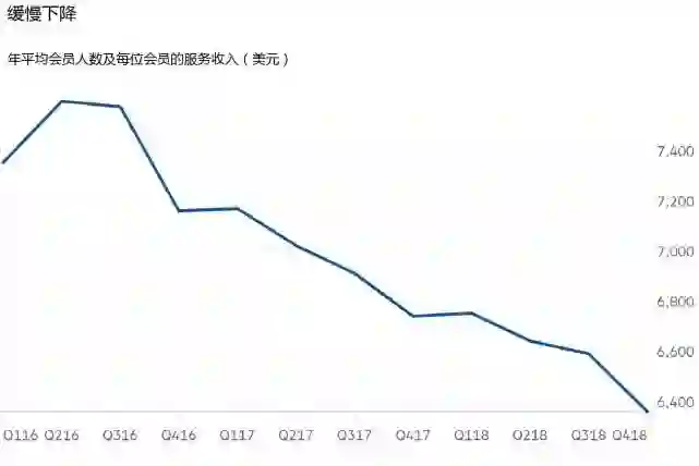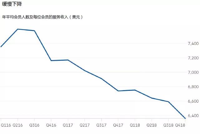 正如之前报道的那样,WeWork的年度平均会员人数和每名实体会员的服务收入也出现了下降。该公司在其债券发行中将其列为关键指标之一。2018年最后一个季度,该指数跌至3年来的最低点,从2016年初的7353美元降至每位会员6360美元。