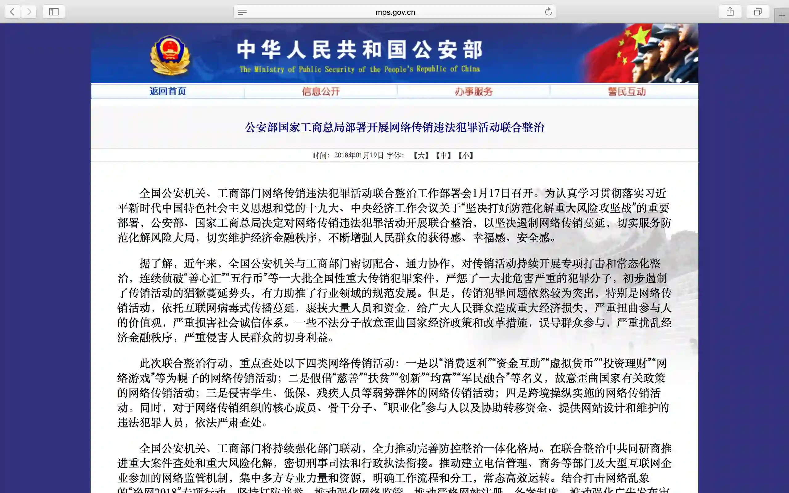 全国公安机关、工商部门网络传销违法犯罪活动联合整治工作部署会1月17日召开。为认真学习贯彻落实习近平新时代中国特色社会主义思想和党的十九大、中央经济工作会议关于“坚决打好防范化解重大风险攻坚战”的重要部署,公安部、国家工商总局决定对网络传销违法犯罪活动开展联合整治,以坚决遏制网络传销蔓延,切实服务防范化解风险大局,切实维护经济金融秩序,不断增强人民群众的获得感、幸福感、安全感。