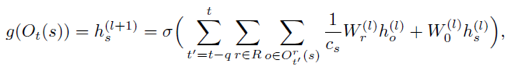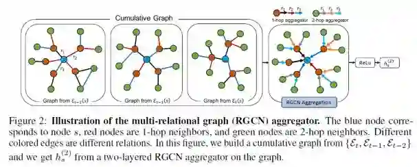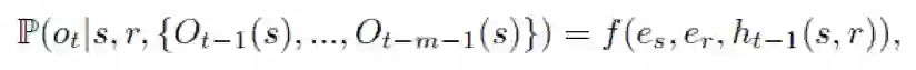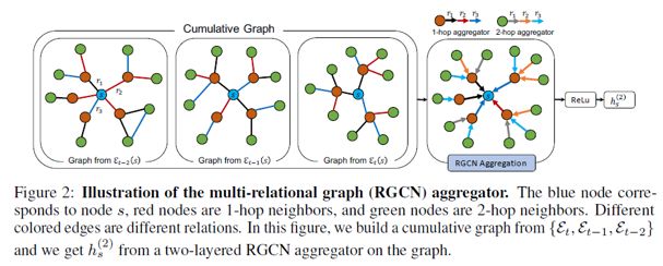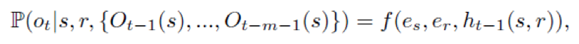 1. 对于历史时刻(图中为t-1, t-2, t-3),将各时刻es包含的邻居实体聚合为x,与es及关系er一起作为RNN的输入