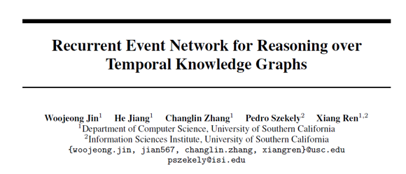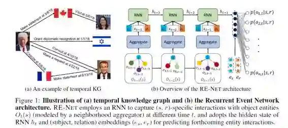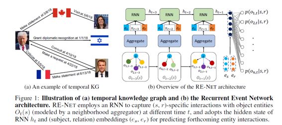 本文提出了一种建模时序、多关系、图结构数据的神经网络方法,称为循环事件网络(RE-NET),该模型由RNN事件序列编码器和近邻聚合模型组成。其中,近邻聚合模型将每一时刻主实体通过关系连接的邻居(一跳或两跳)进行信息聚合,与主实体(Subject)、关系(Relation)的向量表示一同作为RNN的输入,从而实现数据建模,用于预测某时刻主体事件s在关系r上对应的客体事件o,(假定图谱四元组表示为(s, r, o, t),任务目标是预测(s, r, ?, t)或(?, r, o, t)中的?)。
