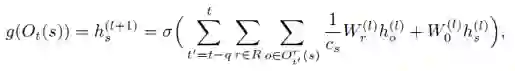 2. 将RNN末端(即时间t)得到的隐状态取出,与es和关系er融合给出t时刻e和er对应的客体o的概率分布