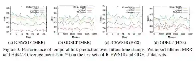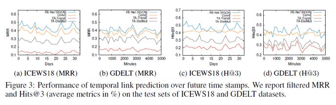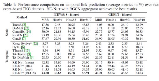 本文参照的Baseline被分为统计方法(TransE, DisMult,ComplEx, R-GCN, ConvE)和时序推理方法(Know-Evolve, TA-TransE/DistMult,HyTE, TTransE)