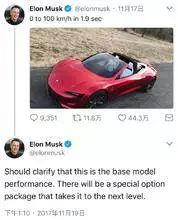 美国当地时间11月19日,特斯拉CEO马斯克称,目前推出的新款跑车Roadster只是低配版,未来将推出高配版。据悉, Roadster内置三个电动机,前部一个,后部两个,驱动形式为四驱,峰值扭矩可达10000牛米扭矩,1.9秒加速至60英里(约96.56公里)每小时,4.2秒加速至100英里每小时,最高时速可达250英里(400公里),续航里程超过620英里(约1000公里)。