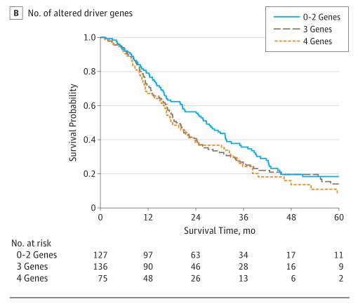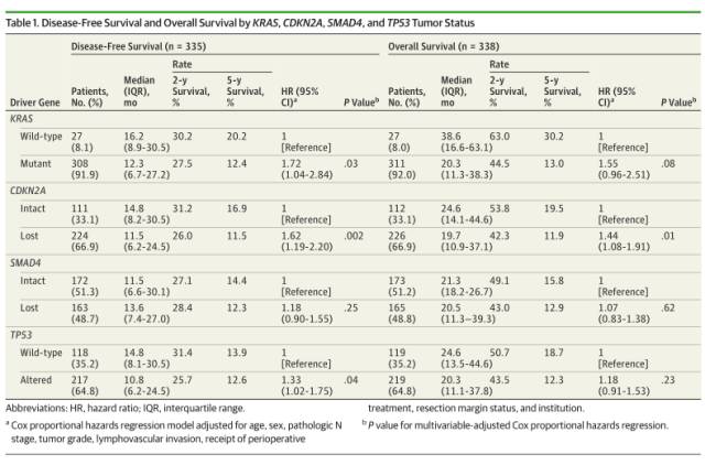 参考文献:Zhi Rong Qian et al. Association of Alterations in Main Driver Genes With Outcomes of Patients With Resected Pancreatic Ductal Adenocarcinoma, JAMA Oncology (2017). DOI: 10.1001/jamaoncol.2017.3420
