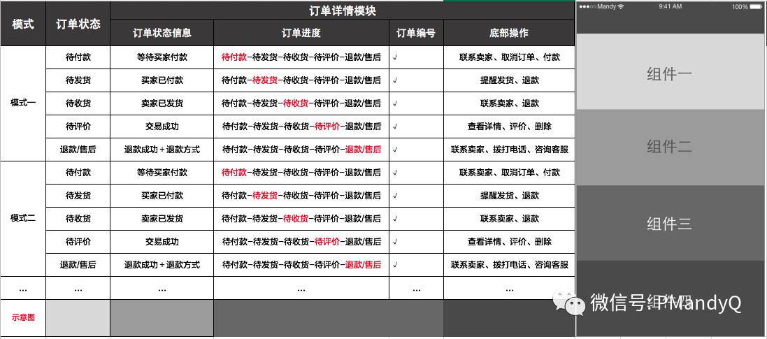 根据固定的状态设置,可以把界面的组合分为几种组件模块,然后映射到Excel表,加以说明和标注,如图表所示,右侧Excel表的底部一栏色块对应右侧原型图的不同模块,二者对应可解释说明不同模式下订单详情页面的组件元素有哪些?不同之处是什么?