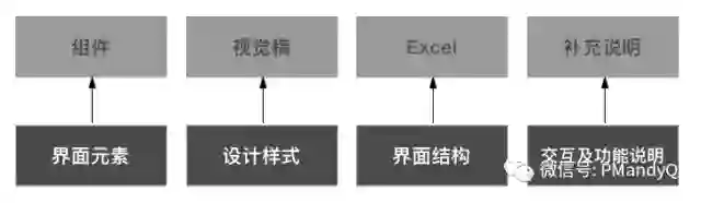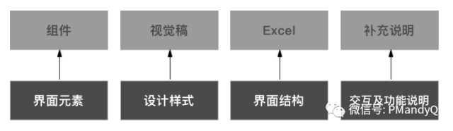 组件化思维法,简单来讲就是:组件+UI设计稿+Excel+补充说明=PRD。此思维方法涉及到的每一个关键内容,对应的作用描述如下图深色色块所示: