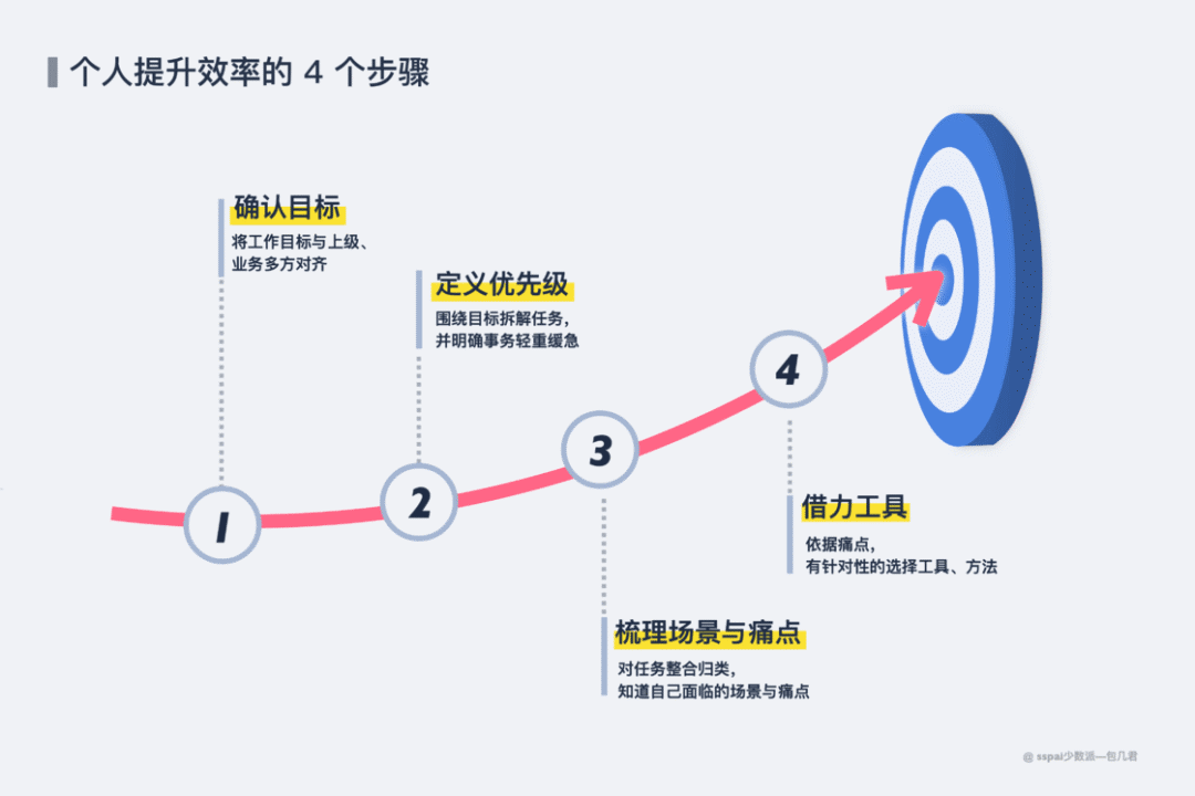 目标与优先级这两个步骤,一是将自己的任务比对上级任务与业务方向,如果发现偏差及时沟通及时调整;其次是根据价值程度划定优先级。目标拆解后的事儿肯定很多,但不是什么简单做什么,而是根据价值决定首先应该做什么。