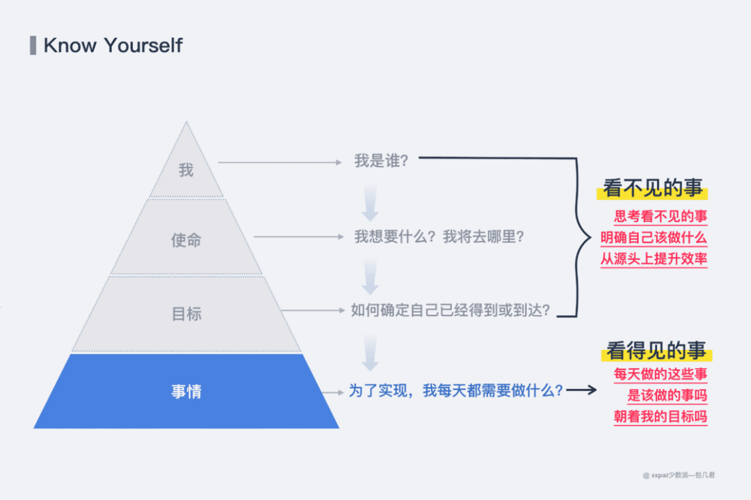 人生中真正的重要的事其实只有一件,就是苏格拉底告诉我们的 Know Yourself 。这是效率问题的关键,也可能是所有问题的关键。