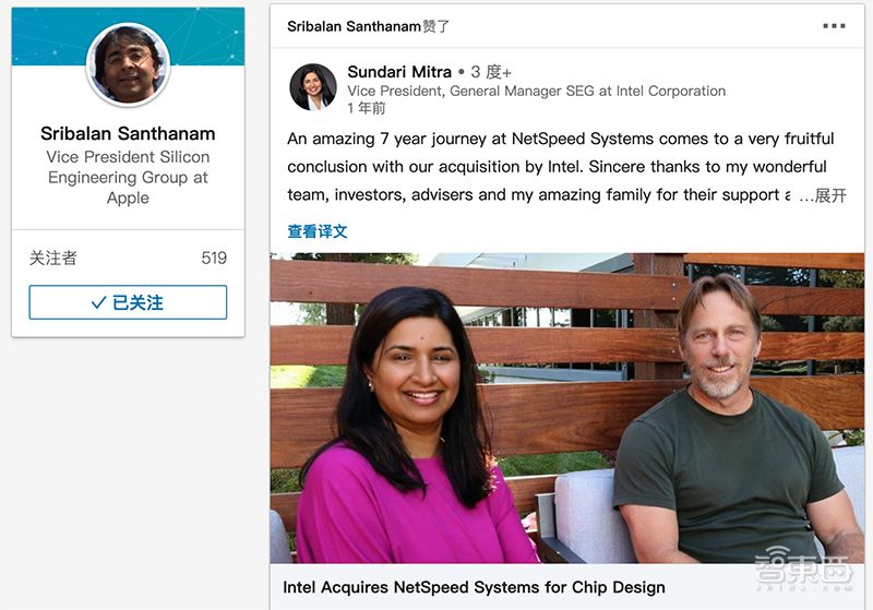 再看看他的社交平台,也仅有少得可怜的一条信息,显示他在2018年为NetSpeed的CEO Sundari Mitra的动态点了个赞,那是一条关于英特尔收购NetSpeed以改进其芯片业务的消息。