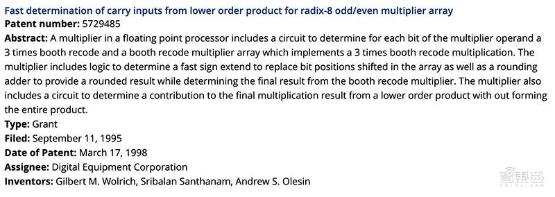 早在1995年,在美国DEC工作的他提交了一项名为《快速确定从低阶积进位输入的x-8奇/偶乘法器阵列(Fast determination of carry inputs from lower order product for radix-8 odd/even multiplier array)》的专利申请。