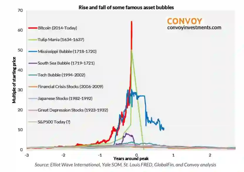 要知道在2010年,一份价值25美元的披萨就花掉了买主1万枚比特币,相当于一枚比特币价值0.25美分。七年时间身价暴涨400万倍,使得比特币超过荷兰“郁金香狂热”和英国“南海公司骗局”,成为人类历史上最大的一次资产泡沫。
