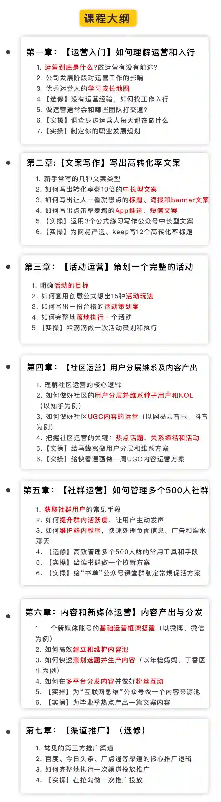 课程极其注重落地和实操,能够全方位帮助小白了解运营工作的基础内容和方法,并且手把手教你如何落地执行、如何一步步完成leader交代你的任务。