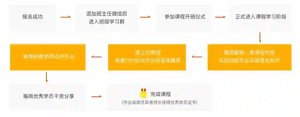 为最大程度上照顾到所有学员学习时间,三节课课程都为线上录播课程,报名后学习流程参考如下: