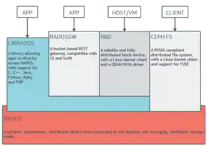 Ceph架构相当复杂的,其中使用到大量的底层技术,例如RADOS、librados、RADOSGW、RDB、CRUSH算法,外加monitor、OSD以及MDS等功能性组件。这里我们先不谈它的底层架构,关键在于Ceph属于一种分布式存储集群,这使得扩展更便利、能够在不牺牲性能的前提下消除单点故障,且提供涵盖对象存储、块存储以及文件存储的统一存储体系。